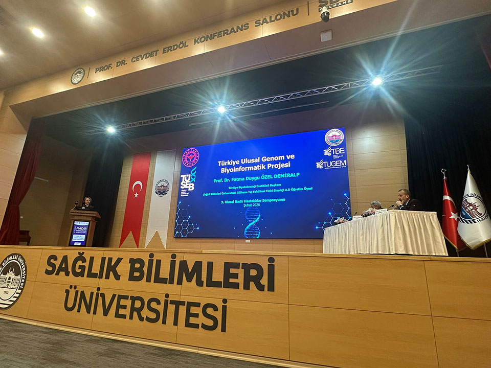Sempozyum kapsamında Enstitü Başkanımız Prof. Dr. F. Duygu Özel Demiralp, “Türkiye Ulusal Genom ve Biyoinformatik Projesi” başlıklı sunumuyla konuşmacı olarak yer aldı. Prof. Dr. Demiralp konuşmasında, Türkiye Ulusal Genom ve Biyoinformatik Projesi’nin; ülkemizde genom verilerinin sistematik ve güvenli biçimde toplanması, ileri düzey analiz yöntemleriyle değerlendirilmesi ve güçlü bir ulusal veri altyapısının oluşturulmasını hedeflediğini ifade etti. Projenin, başta nadir hastalıklar olmak üzere birçok hastalık grubunda erken tanı, doğru teşhis ve kişiselleştirilmiş tedavi yaklaşımlarının geliştirilmesine önemli katkılar sağlayacağını vurguladı.