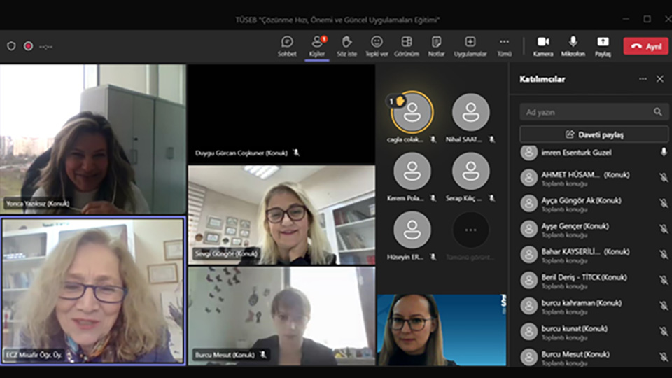 30 Kasım 2023 tarihinde BİYAŞAM-Eğitim Serileri kapsamında T.C. Sağlık Bakanlığı Türkiye İlaç ve Tıbbi Cihaz Kurumu çalışanlarına yönelik “Çözünme Hızı, Önemi ve Güncel Uygulamaları (Çevrimiçi) Eğitimi” TÜSEB Türkiye Biyoteknoloji Enstitüsü araştırmacısı Dr. Öğr. Üyesi İmren ESENTÜRK GÜZEL ve İstanbul Üniversitesi Eczacılık Fakültesi Farmasötik Teknoloji Anabilim Dalı Öğretim Üyesi olan davetli konuşmacılar Prof. Dr. Yıldız ÖZSOY, Prof. Dr. Sevgi GÜNGÖR ve Dr. Öğr. Üyesi Burcu MESUT tarafından çevrimiçi olarak gerçekleştirilmiştir.