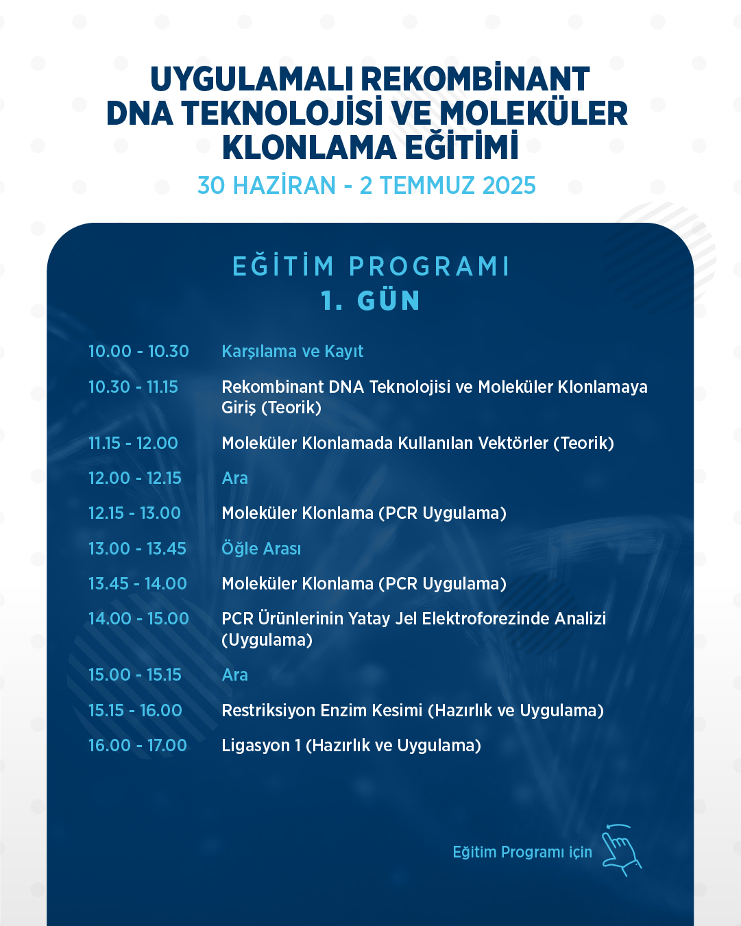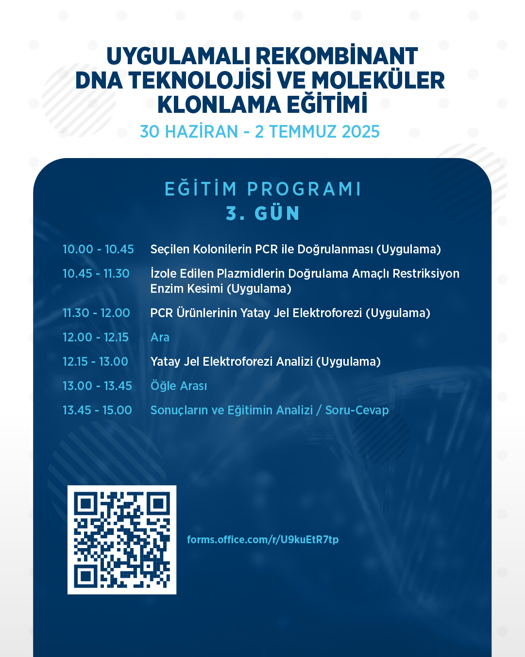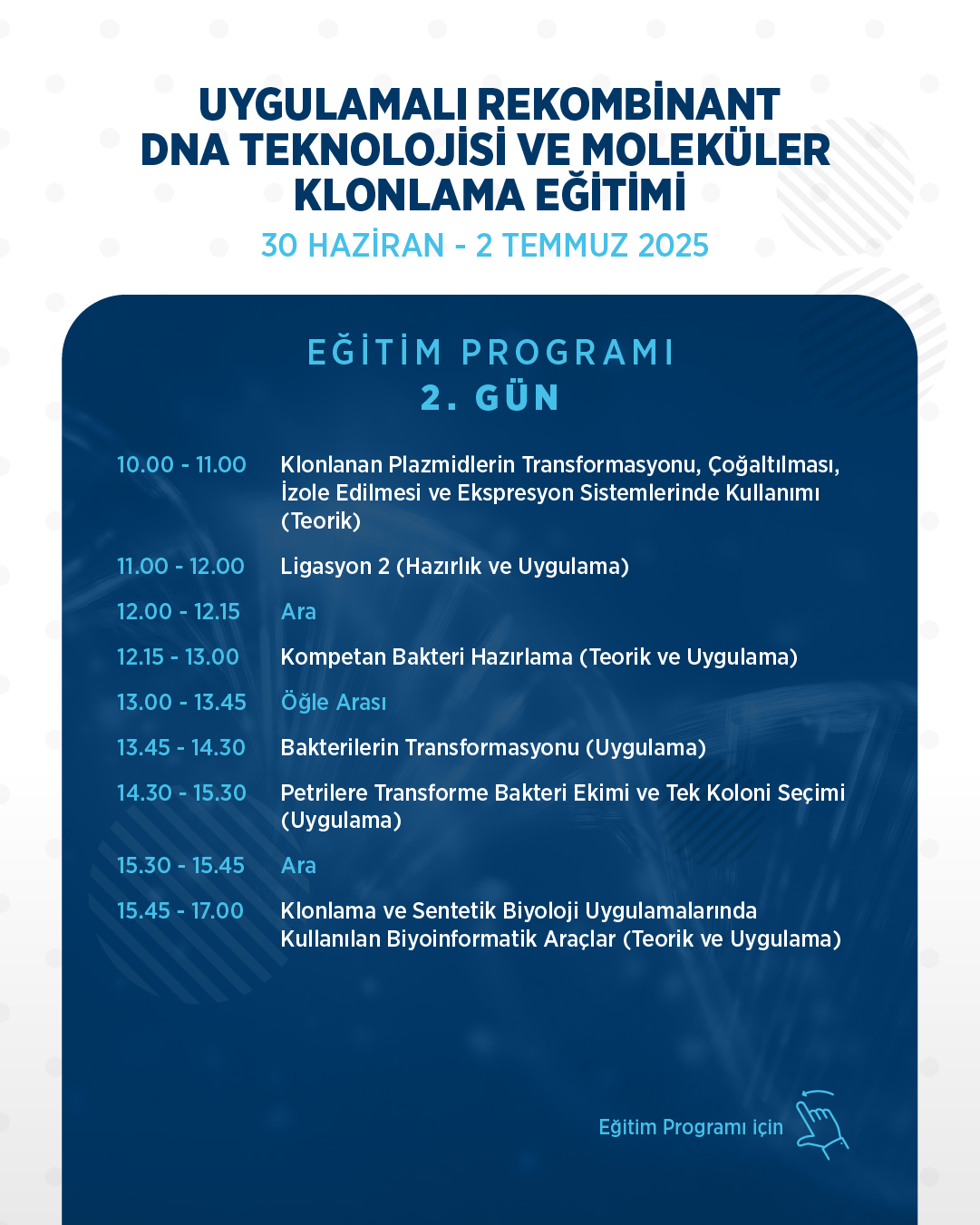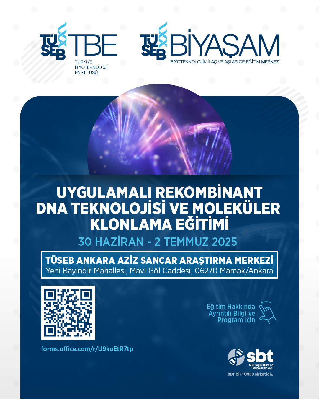 TÜSEB Türkiye Biyoteknoloji Enstitüsü tarafından ‘Uygulamalı Rekombinant DNA Teknolojileri ve Klonlama Eğitimi’ düzenlenecektir. Eğitim 30 Haziran- 2 Temmuz 2025 tarihlerinde TÜSEB Ankara Aziz Sancar Araştırma Merkezi bünyesinde bulunan Biyoteknolojik İlaç ve Aşı Ar-Ge Eğitim Merkezi (TÜSEB-BİYAŞAM)’nde gerçekleştirilecektir.