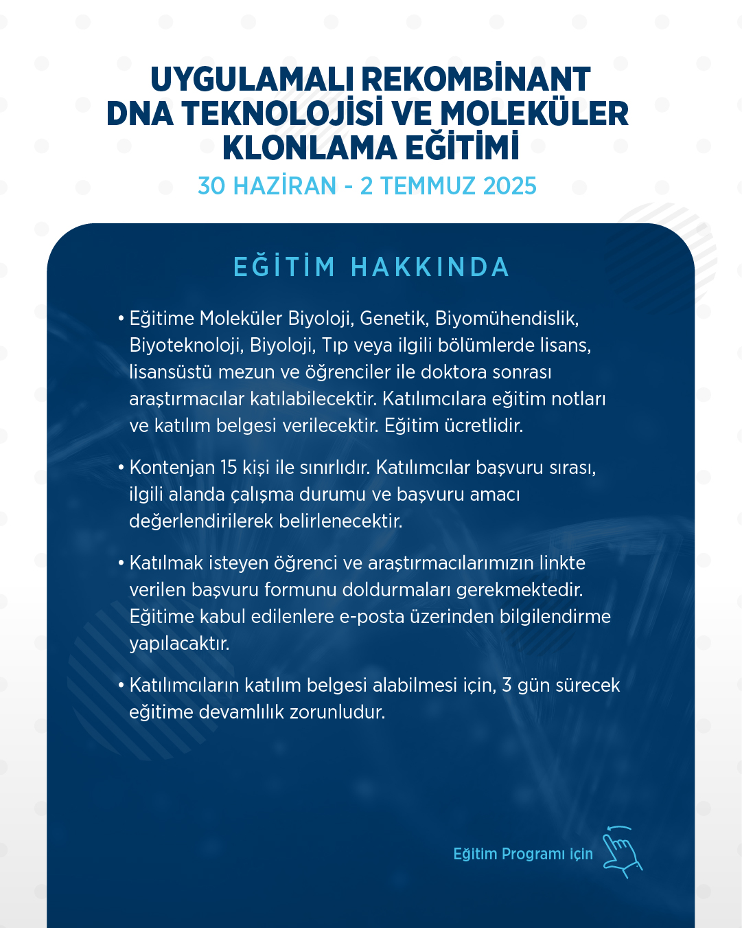 Eğitime Moleküler Biyoloji, Genetik, Biyomühendislik, Biyoteknoloji, Biyoloji, Tıp veya ilgili bölümlerde lisans, lisansüstü mezun ve öğrenciler ile doktora sonrası araştırmacılar katılabilecektir.