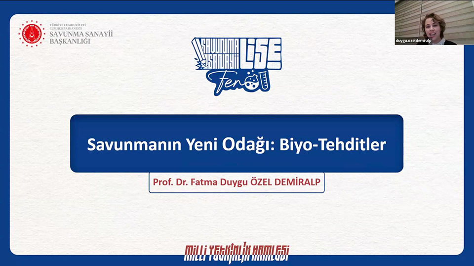Türkiye Biyoteknoloji Enstitüsü Başkanı Prof. Dr. F. Duygu ÖZEL DEMİRALP tarafından ASELSAN, TUSAÇ, BİTES, HAVELSAN, Savunma Sanayii Başkanlığı, Savunma Sanayii Akademi’den uzmanların eğitmen olarak katıldığı Savunma Sanayii Akademi’nin eğitim programında “Savunmanın Yeni Odağı: Biyolojik Tehditler” konusunda eğitim verildi. 09.12.2024 tarihinde gerçekleşen eğitim 250’nin üzerinde fen lisesi öğrencisinin katılımıyla gerçekleşti.